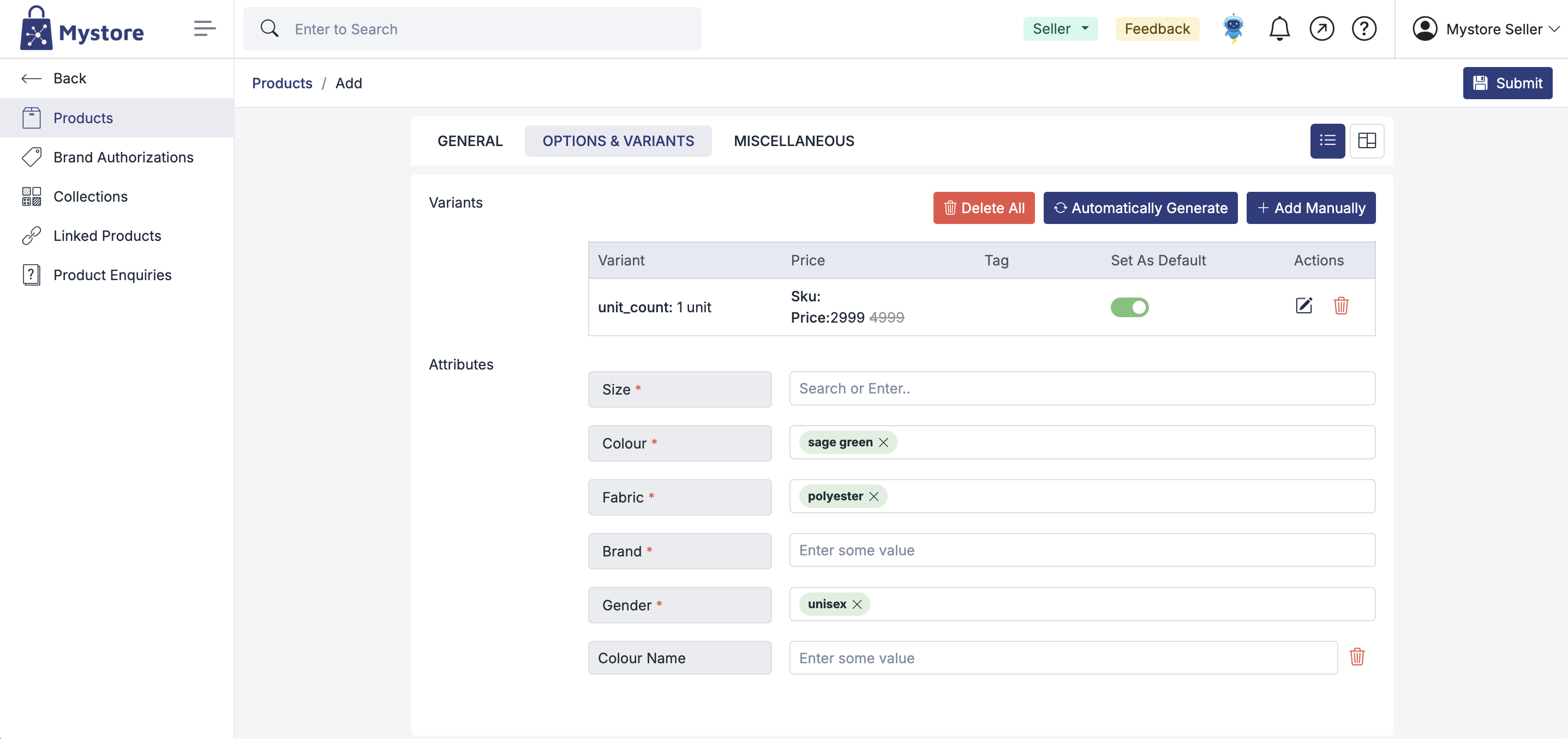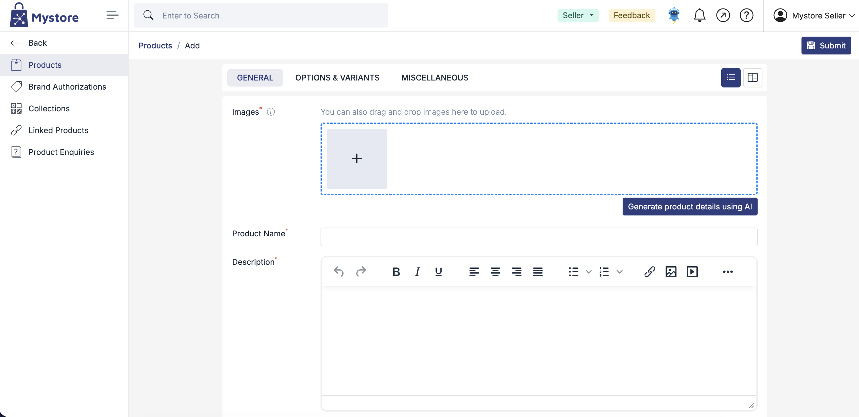 Adding products manually in Mystore lets you create and manage product listings with complete control. You can easily add key details such as product name, category, price, inventory, images, and descriptions from the seller dashboard. This option is ideal for adding a small number of products, customizing individual listings, or making quick updates without using bulk upload tools.