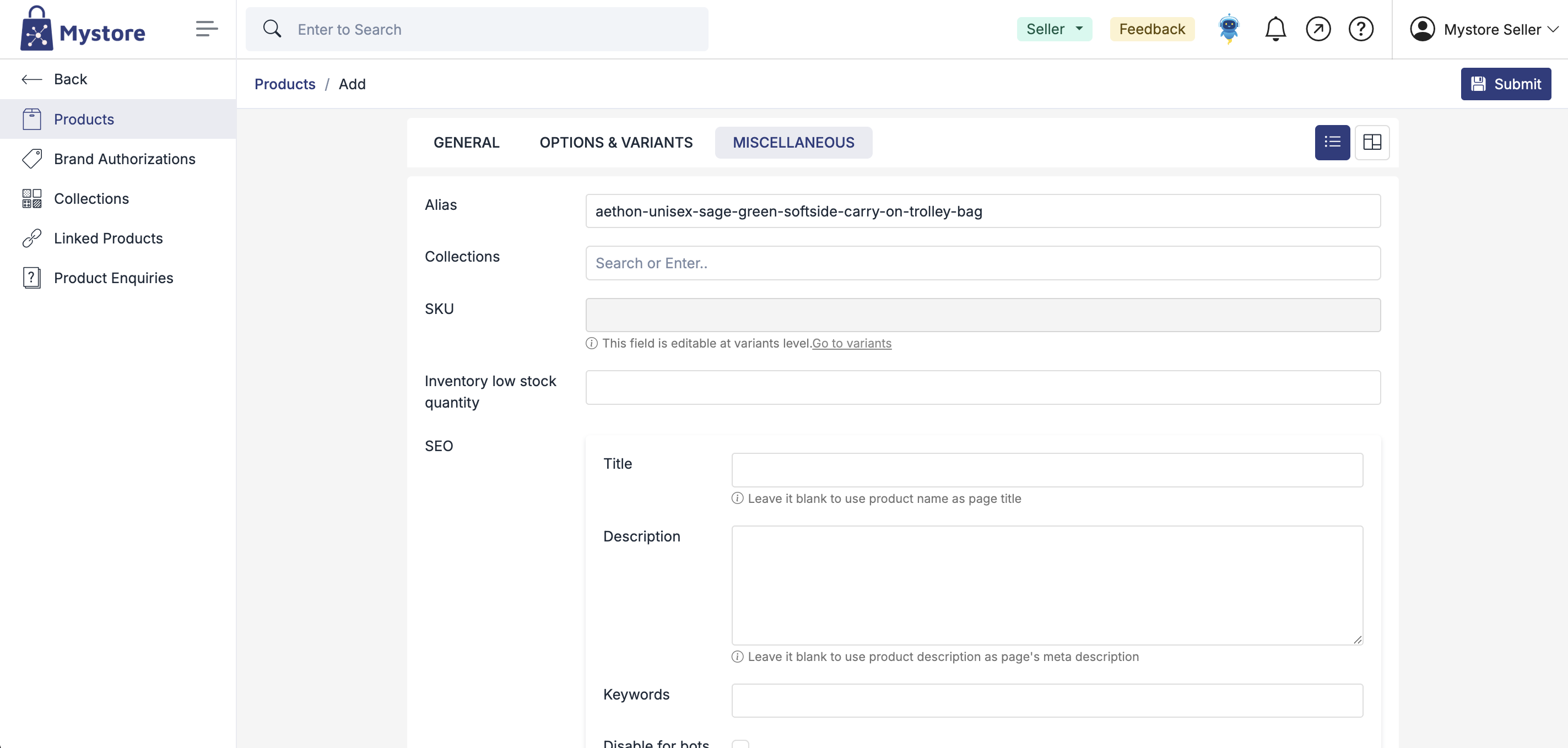 SEO (Title, Description, Keywords) | Optional fields for customizing search engine metadata. Leave blank to auto-fill from the product title and description. |