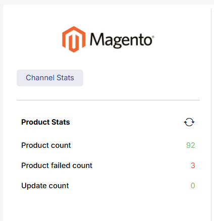 Channel Stats: You can check your channel stats and channel records which includes product count, product failed count and update count on your admin dashboard as shown: