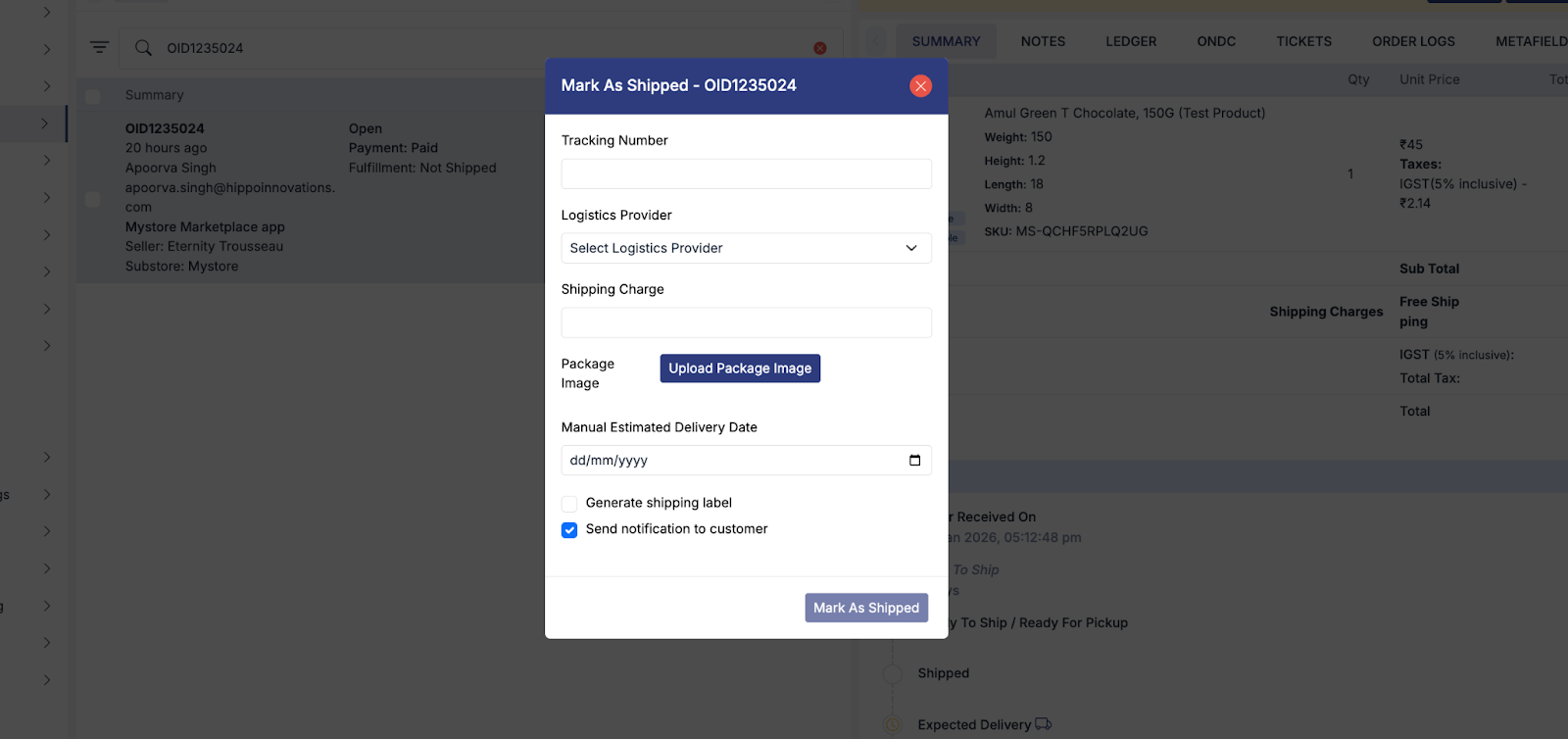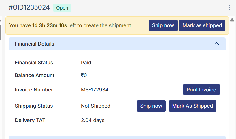 When you are using your own non-integrated logistics service partner, you need to click on “mark as shipped” from order details. You can use the same function of shipping from the top ribbon or the financial details section.