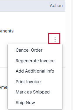 The Order Actions Menu (⋮) lets sellers manage individual orders quickly from the Orders dashboard.