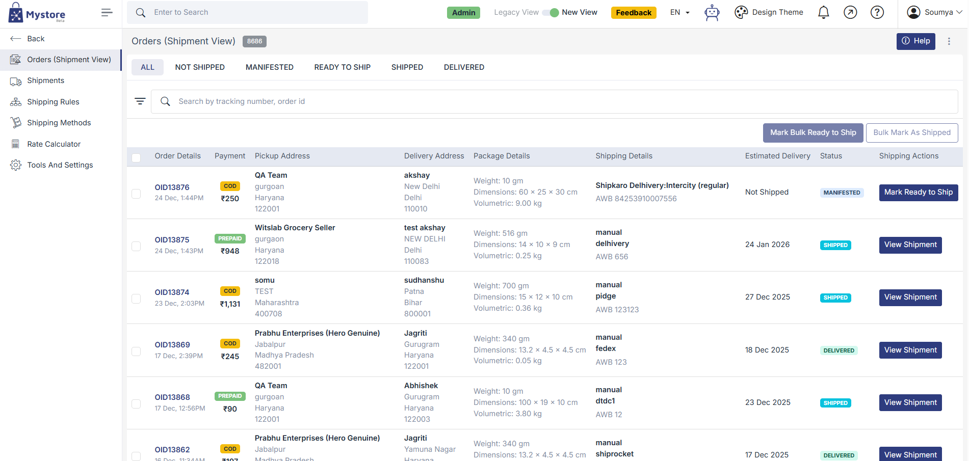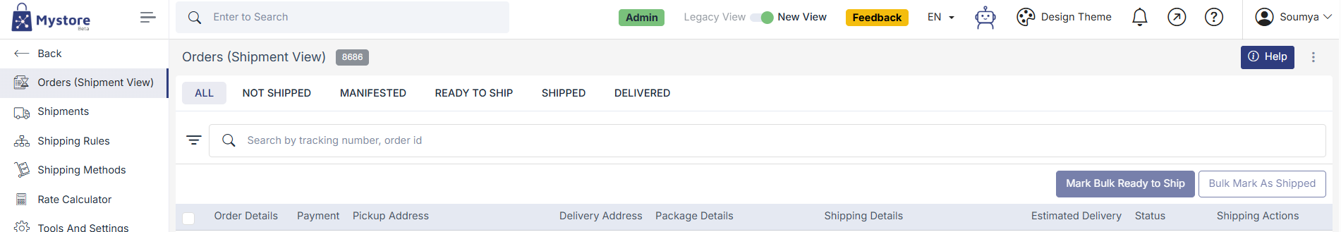 The Orders (Shipment View) section is used to manage the complete shipping lifecycle of your orders. From this page, sellers can track order movement, view shipment information, and perform shipping-related actions such as marking orders ready to ship or shipped.