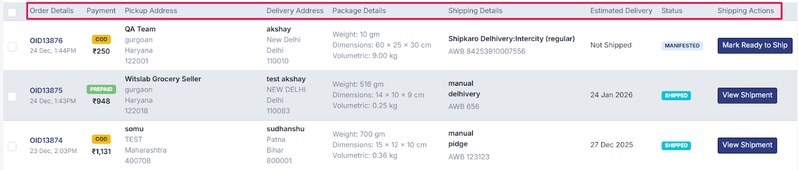 This view is especially helpful when handling multiple orders, as it gives clear visibility into the current shipping status of each order.