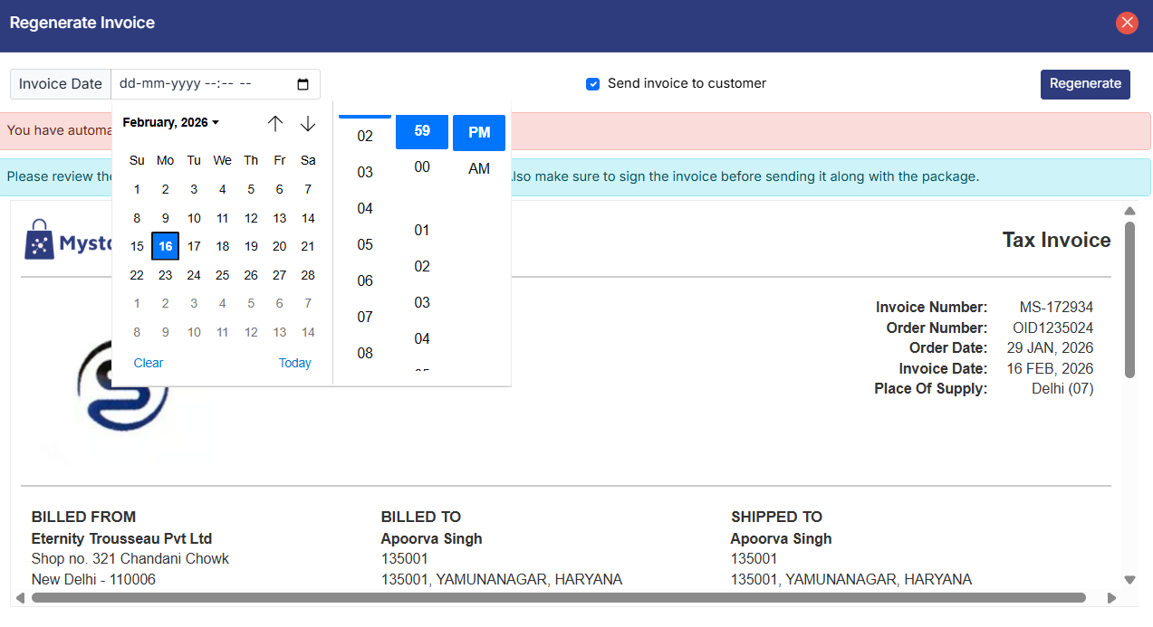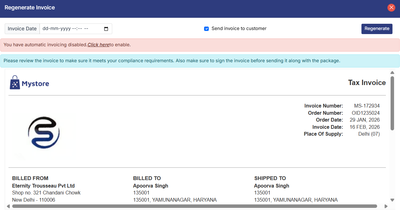 Clicking on this option will open a dialog box showing the preview of the invoice. You can choose whether you want to send this regenerated invoice to the customer. Click on the Regenerate button to regenerate the invoice.
