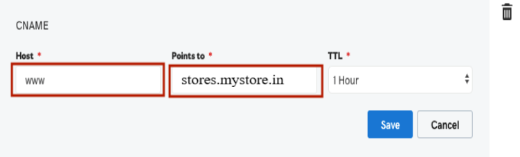- Add a CNAME record for your www domain (e.g.,www.example.com) and point it to your Mystore URL (e.g., example.mystore.in).
