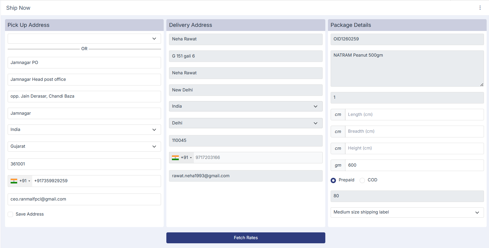 - Click Fetch Rates to view available courier options.