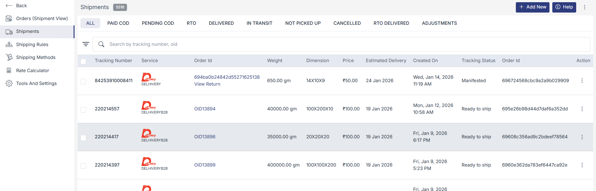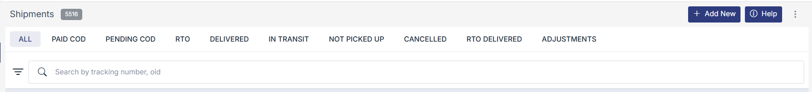 Shows every shipment created in your store, including active, delivered, cancelled, and returned shipments.