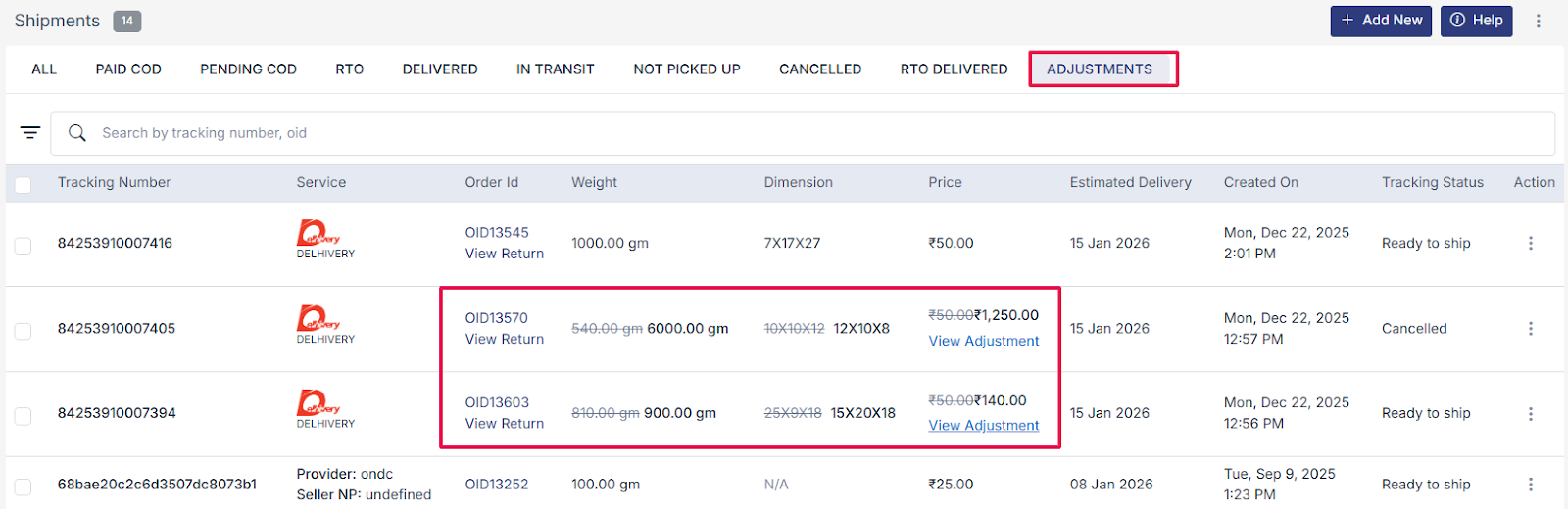 The adjustment section shows all shipments where weight, dimensions, or price were adjusted after booking. Each row shows Tracking Number, Courier Service, Order ID, Weight, Dimensions, Price, Estimated Delivery, Created Date, and Status. Original values (e.g., weight/price/dimensions) are shown struck-through, and updated values are shown next to them.