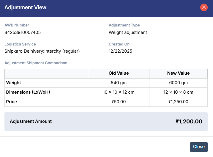 Displays shipment-level adjustments made by the courier, such as changes in weight, dimensions, or shipping charges after verification.