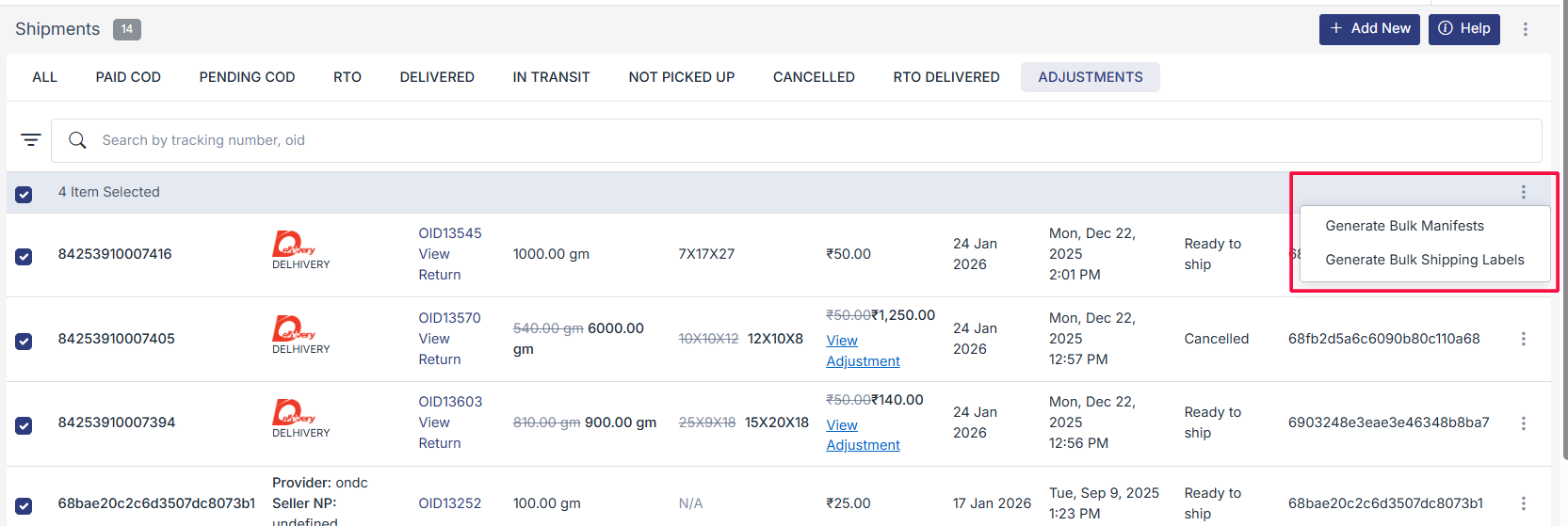 - Generate Bulk Manifests: Create manifests for all selected shipments in one go.