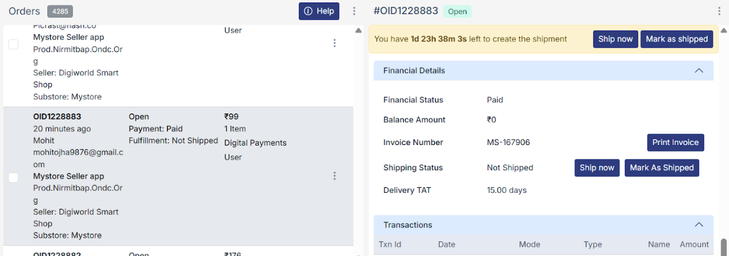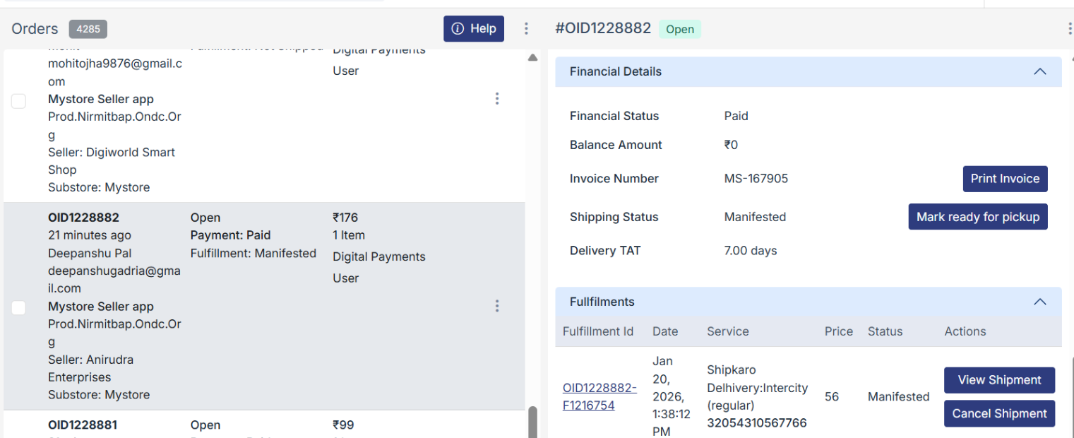 On Network fulfillment refers to orders that are shipped using logistics partners integrated with the ONDC (Open Network for Digital Commerce) platform. In this setup, sellers don’t need to manually arrange shipping the system automatically assigns a logistics provider once an order is confirmed. All shipping steps, including pickup, tracking, delivery, and status updates, are handled within the Mystore dashboard through a streamlined and standardized process. This ensures faster fulfillment, real-time tracking, and reduced manual effort for sellers.