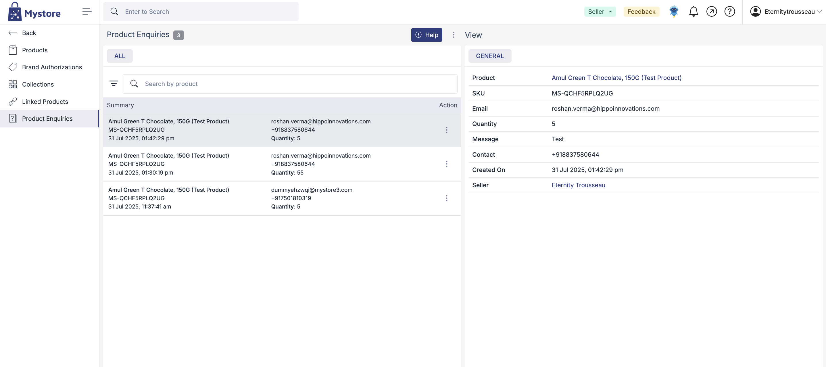 The Product Enquiries section helps you manage questions customers submit about specific products. You can view all enquiries in one place and export them if needed.