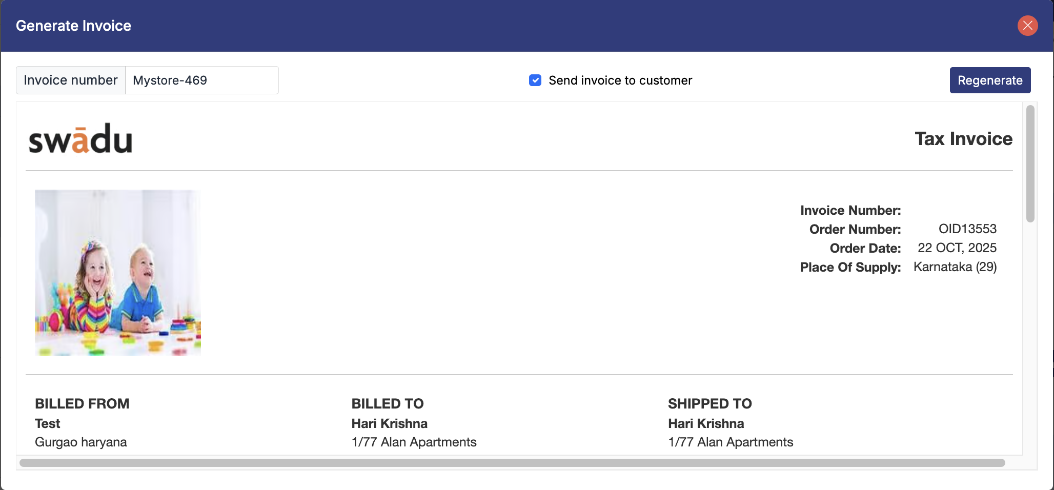 Clicking on this option will open a dialog box showing the preview of the invoice. You can choose whether you want to send this regenerated invoice to the customer. Click on the Regenerate button to regenerate the invoice.